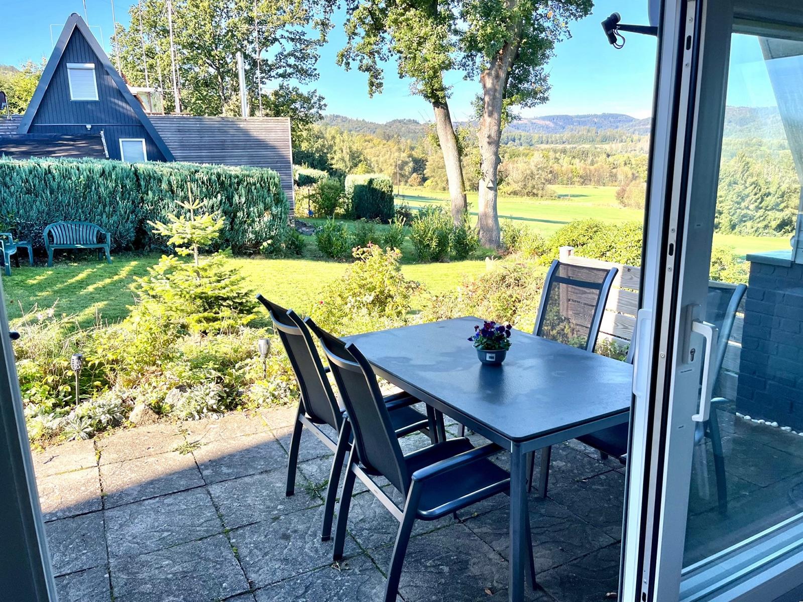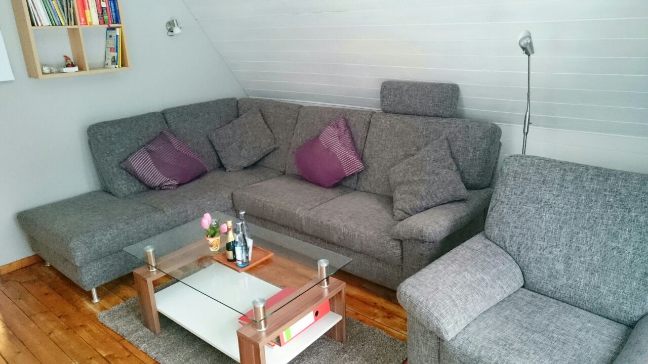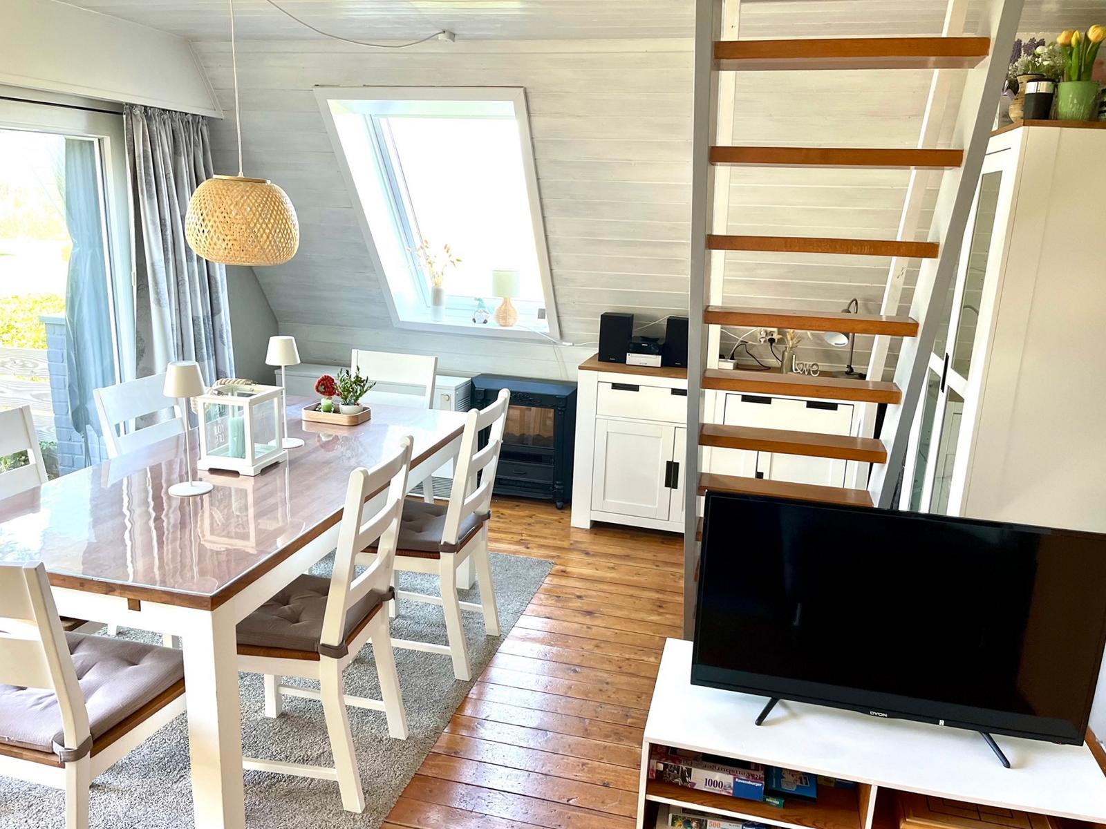 Das Wohn-/Esszimmer mit der Treppe zum Obergeschoss (Schlafzimmer 2):